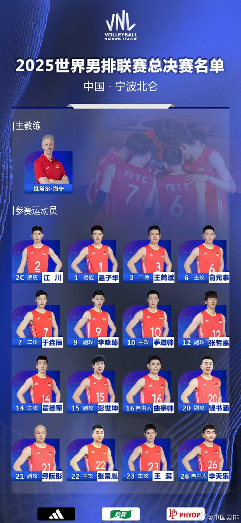7月28日华力网,中国男排参加2025世界联赛总决赛名单公布,共有16名运动员,包括两名替补。