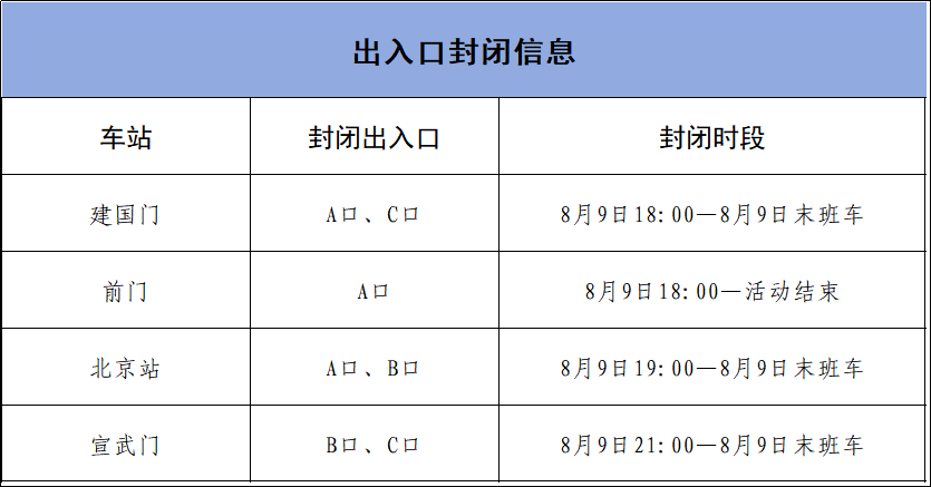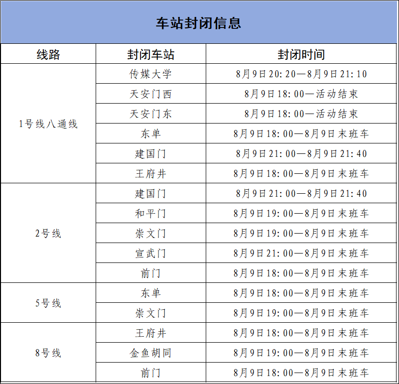 根据北京市公安局公安交通管理局《关于对部分道路采取临时交通管理措施的通告》,为保障专项活动安全顺利,2025年8月9日18时至活动结束,地铁1号线八通线、2号线、5号线、8号线部分车站采取出入口封闭、车站封闭措施仁信,相关换乘站停止换乘,请您合理安排出行。