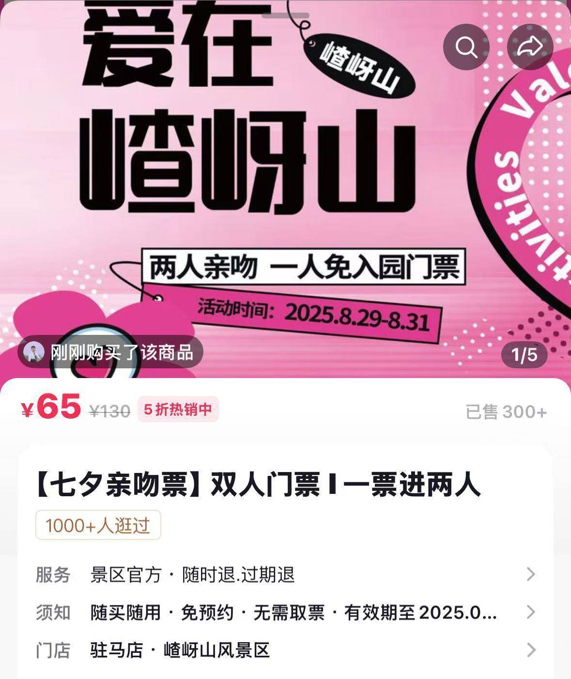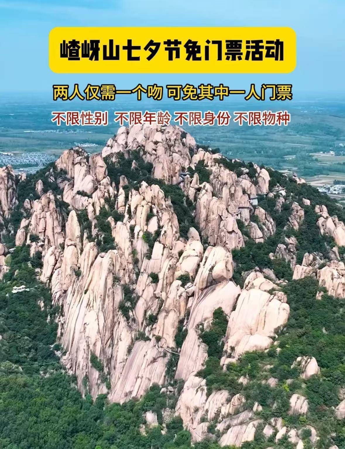 8月27日,嵖岈山风景区官方账号发布视频称,“嵖岈山七夕亲吻免门票活动正式启动”。2025年8月29日至8月31日期间,游客在活动打卡点完成亲吻动作后,其中一人可享受免门票优惠,活动不设性别、物种、年龄及身份限制。